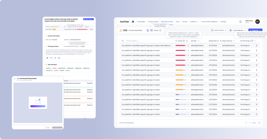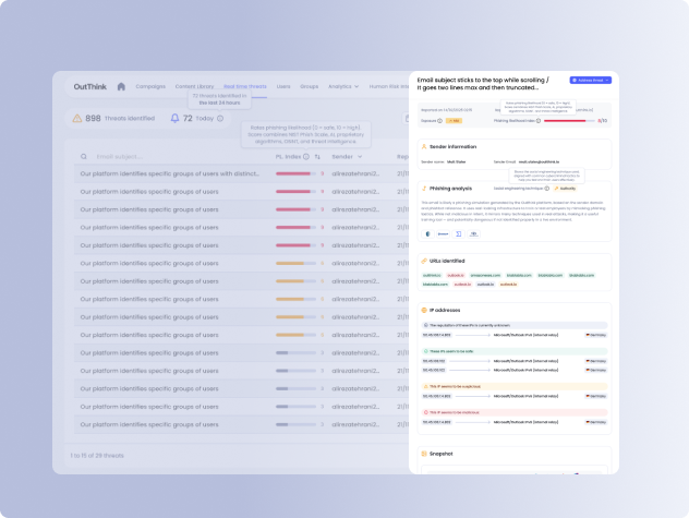 The Real-Time Threats feed gives security teams immediate visibility into potentially malicious emails and enables them to create phishing simulations and targeted nudges for security awareness programs.