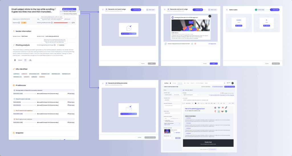When an admin clicks on an item in the Real-Time Threats (RTT) feed, two powerful workflows become available to help turn live threat data into actionable awareness initiatives. First, the admin can generate and send an immediate awareness nudge using details from the reported email, targeting users who may benefit from timely guidance based on actual threats.