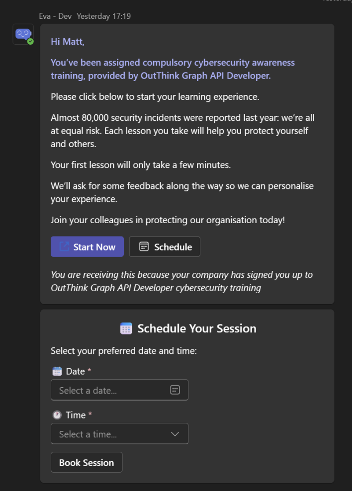 It’s a fast and simple way to stay on track and avoid overdue training. The calendar scheduling functionality will be available by default in all Curriculum campaigns where invites / reminders are set to be sent via Eva / Microsoft Teams.